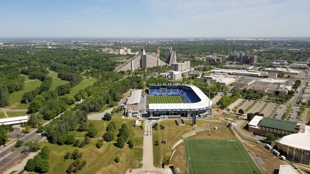 You can take an elevator to the top of the tower, which provides great views in all directions. From the Old Port to the Mountain, and as seen in the picture below, an overview of Saputo Stadium, home of MLS’s Montreal Impact, and the Olympic Villiage, the pyramid looking building.